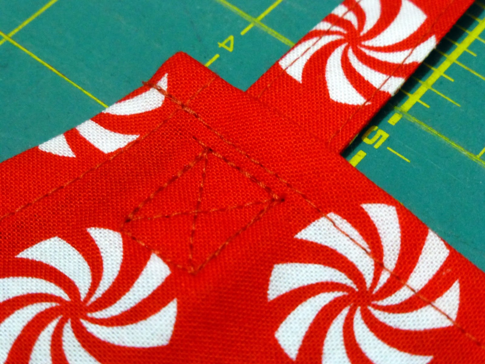 11. Pin one end of the strap onto the wrong side of the top of the apron, and sew it in place in the shape of a box.