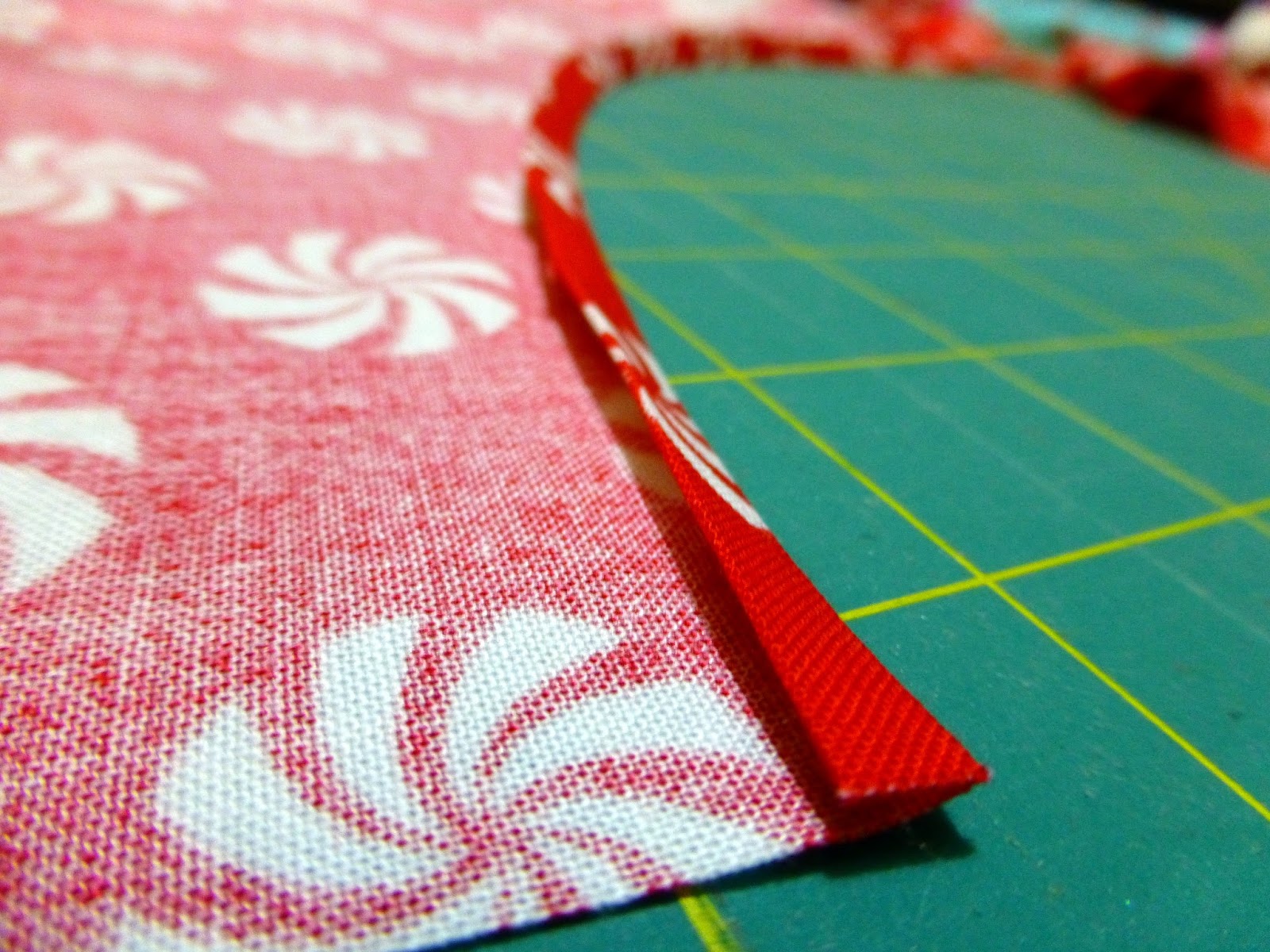 5. Iron this curved edge over ¼” towards the wrong side, and over again, another ¼”. Pin in place. Repeat for the other side.