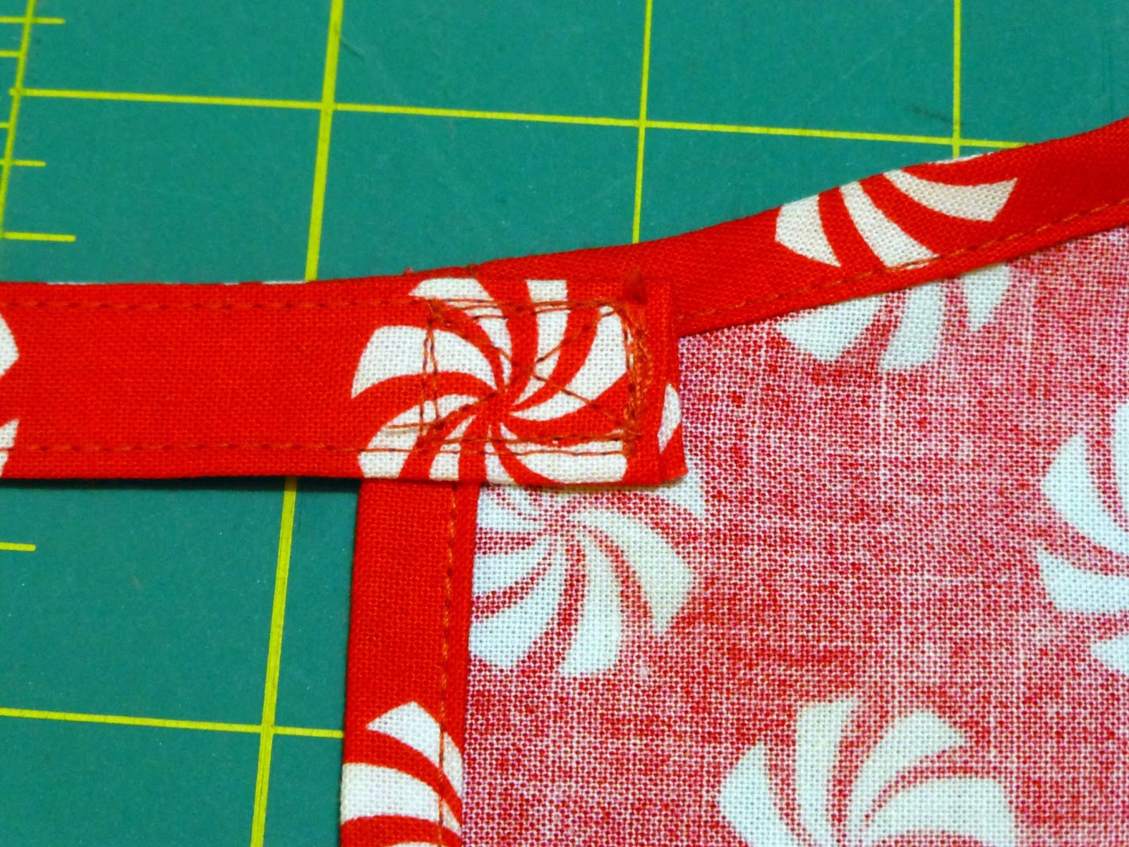 14. Make the ties: Cut 2 strips (2.5” x 44”) and press and sew as for the neck strap. Sew a strip onto each side, just at the corner. Attach to the wrong side and sew a box from the front, as for the neck strap.
