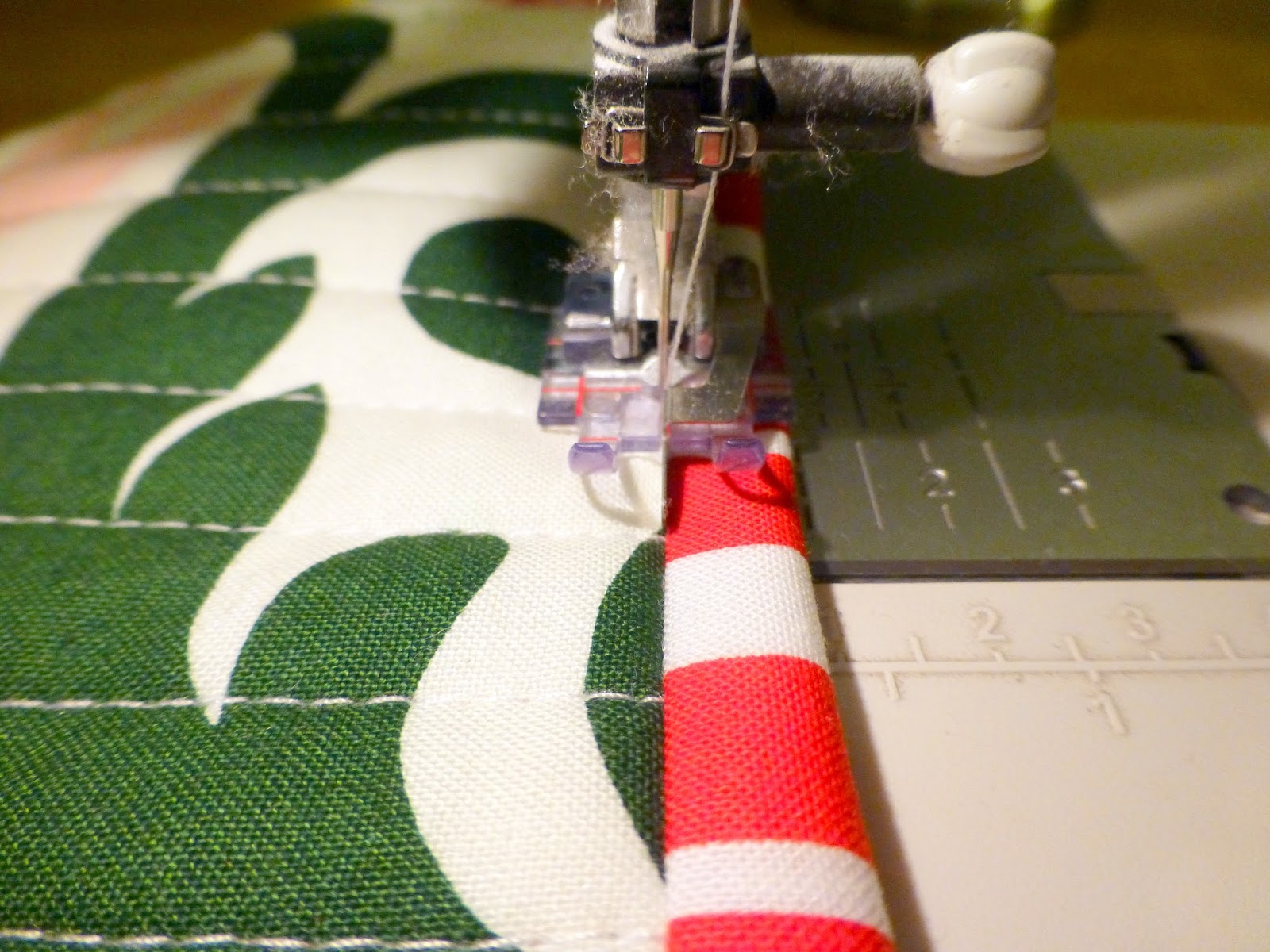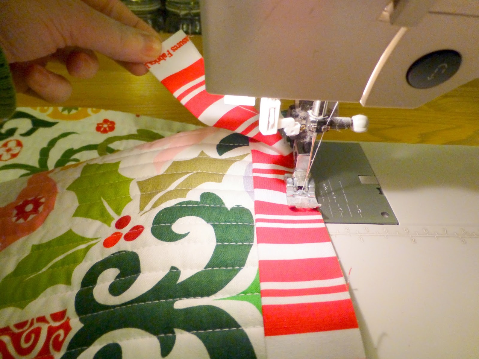 9. Starting at the bottom edge align the binding raw edges with the edge of the mat. Leave 5" free and start sewing the binding down using 3/8" seam allowance, (as you would for a quilt, with mitred corners).