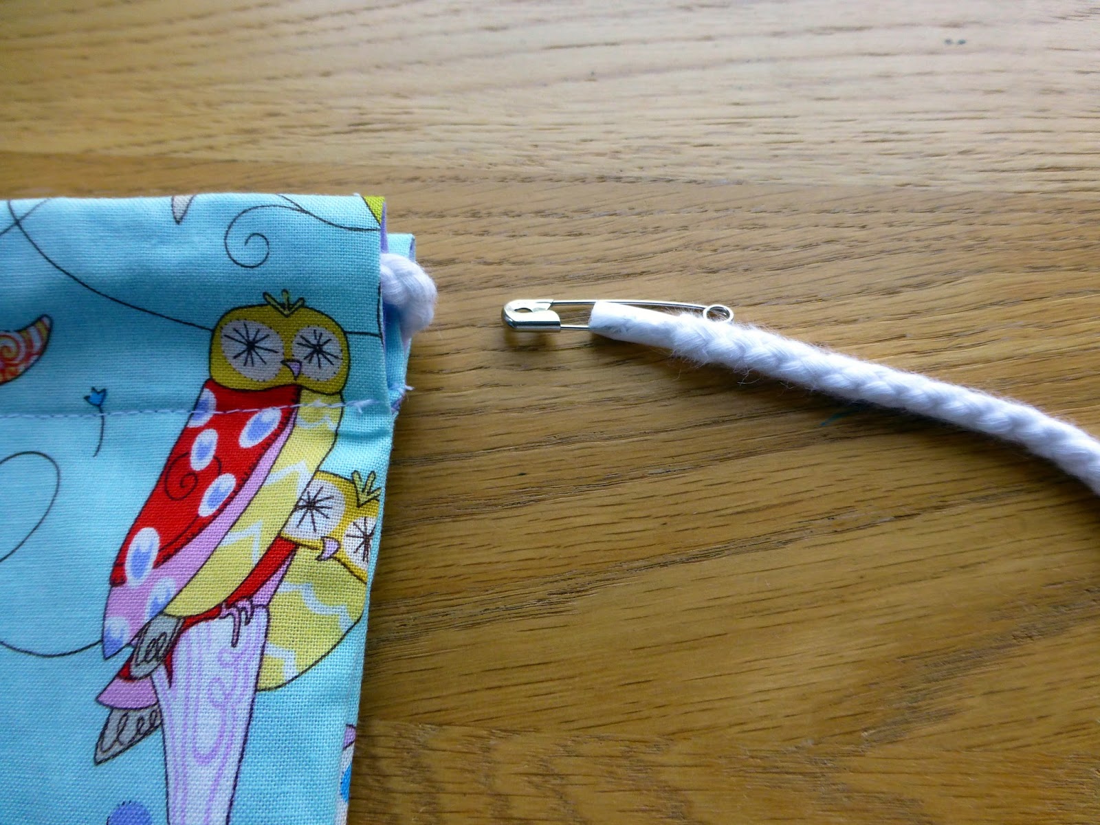 12. Thread one of the cords through one side of the channel, right round until it comes out the same side again (you may find it helpful to attach a safety pin to the end of the cord to do this).